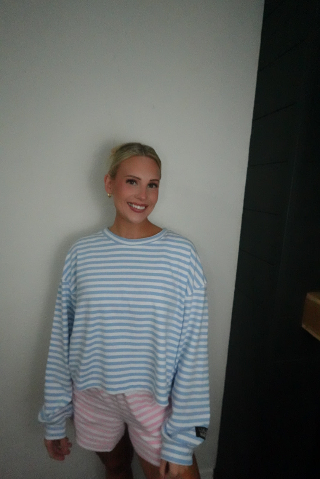 This baby blue stripe long sleeve shirt is designed to pair seamlessly with matching shorts, creating a coordinated set perfect for any casual occasion.