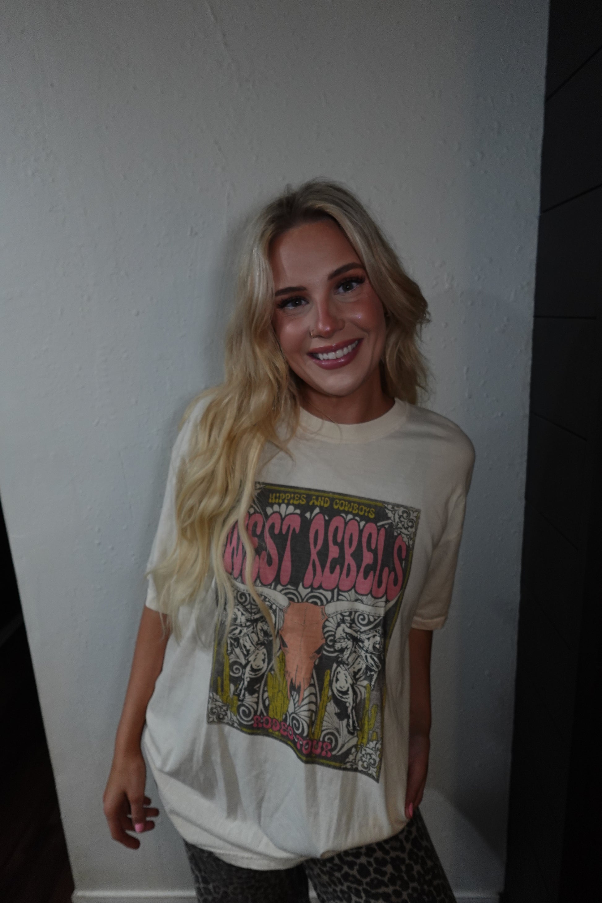 the oversized west rebels vintage tee features a bold, eye-catching graphic, perfect for expressing your rebellious spirit. made with high-quality materials, this tee is durable and comfortable, making it a versatile addition to your wardrobe.